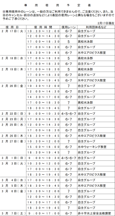 令和8年2月8日(日)は「第26回日立市年齢別水泳大会」開催のため、12時から17時までは一般の方のご利用はできません。 なお、9時から11時15分までに受付していただければ、11時45分まで遊泳可能です。12時までにはお帰りいただきます。 17時以降は通常通りの営業となります。 大会の進捗状況により時間が前後する場合がございます。 ご理解・ご協力をお願いいたします。