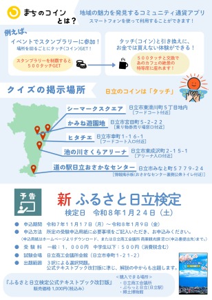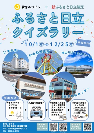 10月1日(水)より、日立の魅力を楽しく学べる『ふるさと日立クイズラリー』が開催されます。 市内5か所に設置されたクイズに参加するとタッチ(コイン)がもらえ、地域のお店や体験で使うことができます。市内をまわってクイズに挑戦しながら、日立の魅力を発見できる参加型のイベントです。ぜひご参加ください。