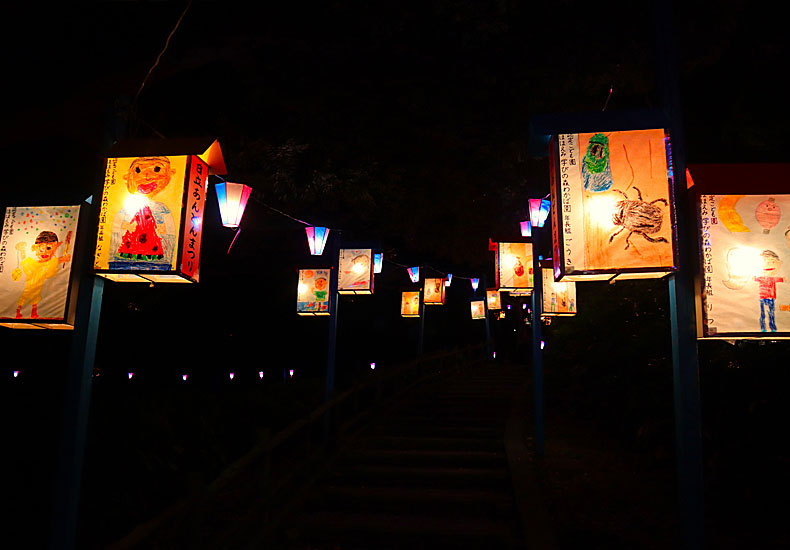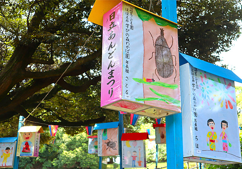 日立あんどんまつり期間中に実施する「こどもあんどん絵画展」は、4歳から中学生までを対象として、海水浴やお祭り、花火大会等々夏をテーマにした絵画を募集し、その作品をひとつひとつ丁寧にあんどんに装飾したものを公園内各所に展示いたします。子供たちの絵が装飾されたあんどんが展示されると昼間は、公園内全体が賑やかで活気のある雰囲気に、夜間は、あんどんのやさしい光が絵画を照らして、公園内全体が幻想的な空間に様変わりします。