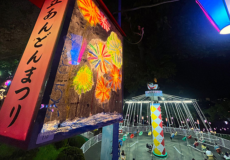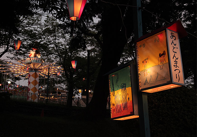 子どもたちが描いた可愛らしい絵画で装飾された行灯の光で公園全体が美しく照らし出されています。