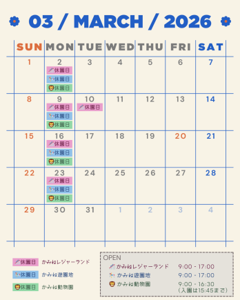 日頃より、かみねレジャーランドをご愛顧いただき、誠にありがとうございます。 さて、当園では冬期営業期間中、休園日を一部変更させていただいておりましたが、3月1日(日)より通常の休園日に変更いたします。